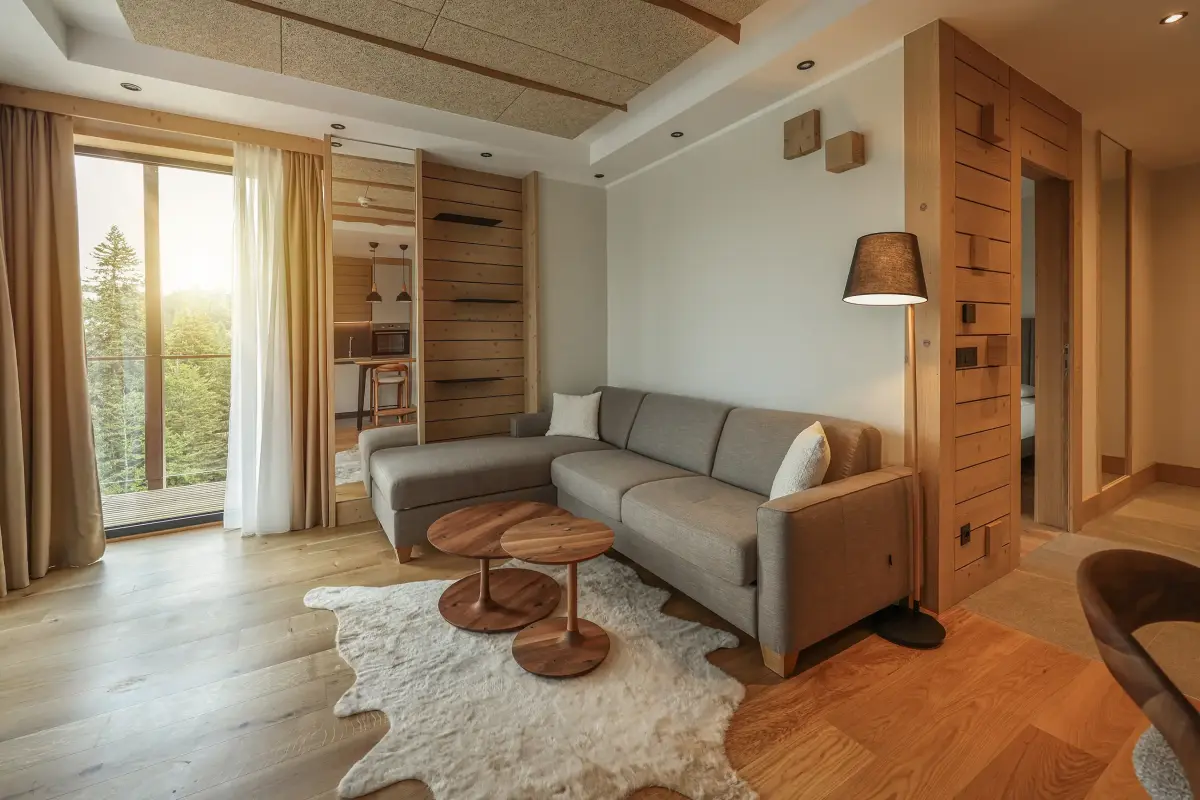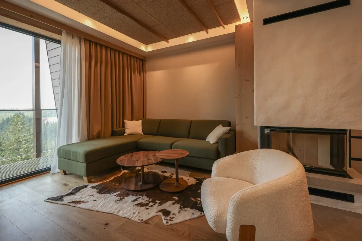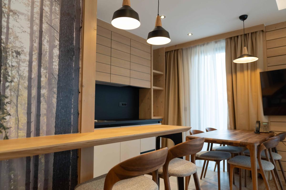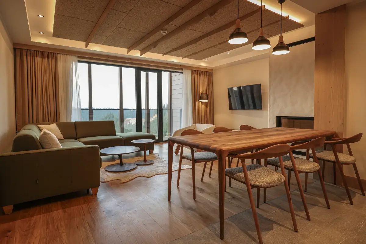 Ulazna vrata u apartmane su protivpožarna sa drvenom oblogom. Opremljena su bravama sa elektroprihvatnikom za kartični sistem dostupa. Sobna i kupatilska vrata su od drveta uklopljena u opšti izgled enterijera prostora sa HAFELE okovom. Pod je obložen višeslojnim hrastovim parketom, prve klase, debljine 14 mm od renomiranog proizvođača. U objektu je korištena retifikovana keramika renomiranih španskih i italijanskih proizvođača Porcelanossa i Keope. Sanitarije u objektu su od evropskih premijum proizvođača Villeroy&Boch i Grohe. Tuš baterije i česme su modernog dizajna predviđene za lako održavanje, visok sjaj kao i optimalnu potrošnju vode od svjetskih renomiranih proizvođača prve klase- Grohe. Kupatila su izvedena po sistemu “Walk in shower”, tj. sa linijskom kanalicom za odvod vode. Rasvjeta u apartmanima je rađena kao kombinacija indirektne LED rasvjete, ugradnih tačkastih svjetiljki i dekorativne rasvjete.