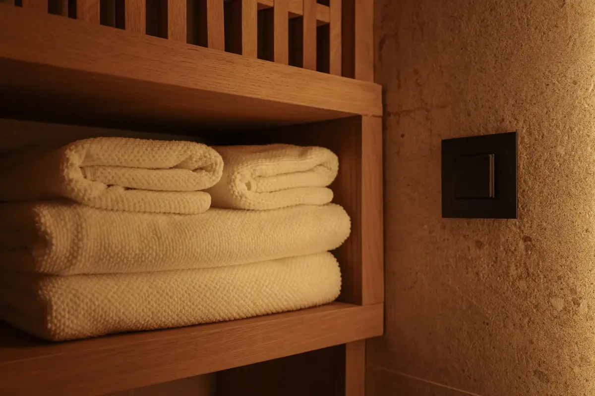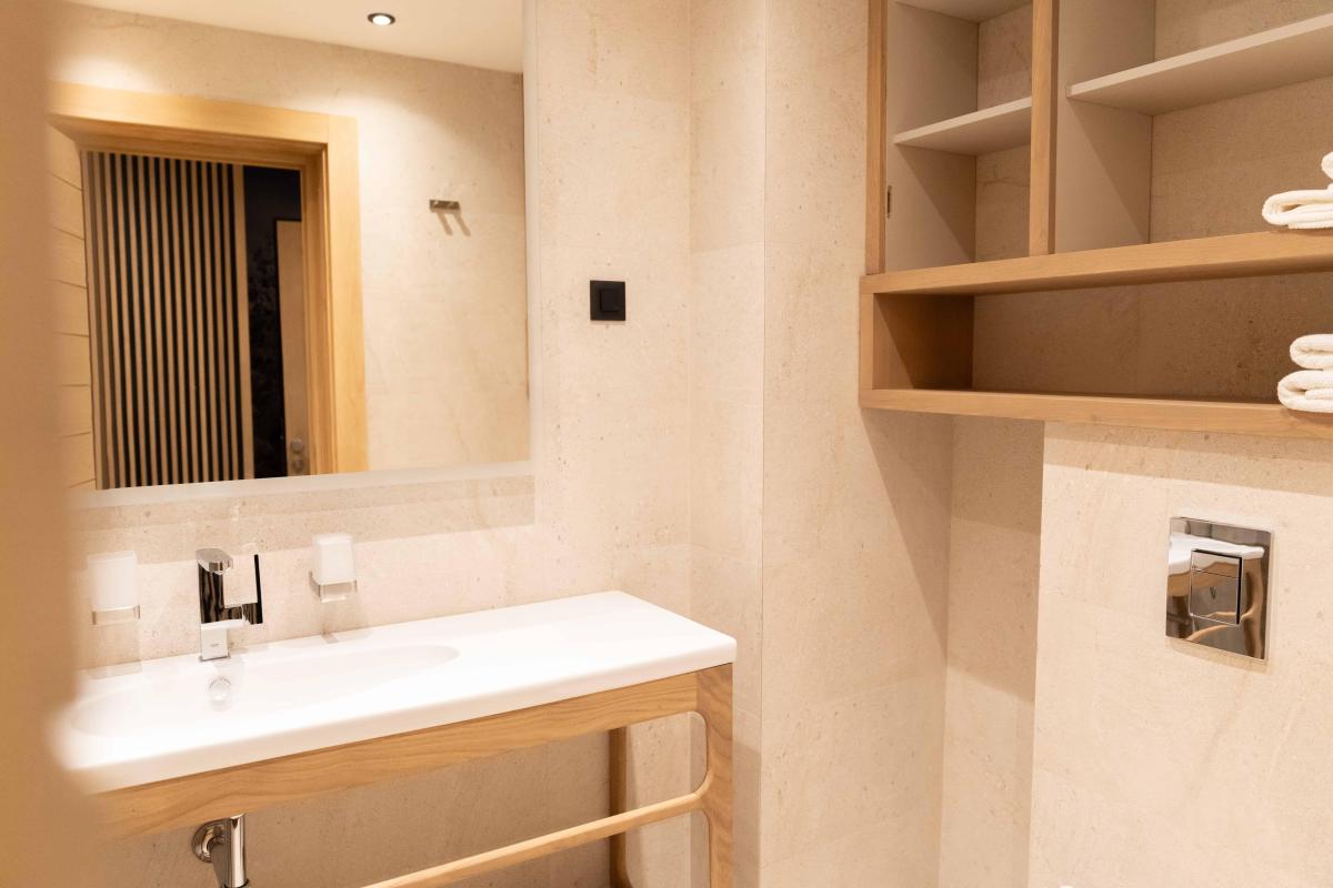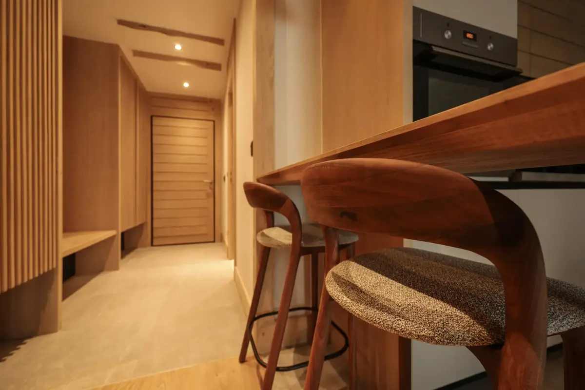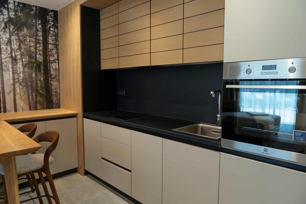 Ulazna vrata u apartmane su protivpožarna sa drvenom oblogom. Opremljena su bravama sa elektroprihvatnikom za kartični sistem dostupa. Sobna i kupatilska vrata su od drveta uklopljena u opšti izgled enterijera prostora sa HAFELE okovom. Pod je obložen višeslojnim hrastovim parketom, prve klase, debljine 14 mm od renomiranog proizvođača. U objektu je korištena retifikovana keramika renomiranih španskih i italijanskih proizvođača Porcelanossa i Keope. Sanitarije u objektu su od evropskih premijum proizvođača Villeroy&Boch i Grohe. Tuš baterije i česme su modernog dizajna predviđene za lako održavanje, visok sjaj kao i optimalnu potrošnju vode od svjetskih renomiranih proizvođača prve klase- Grohe. Kupatila su izvedena po sistemu “Walk in shower”, tj. sa linijskom kanalicom za odvod vode. Rasvjeta u apartmanima je rađena kao kombinacija indirektne LED rasvjete, ugradnih tačkastih svjetiljki i dekorativne rasvjete.